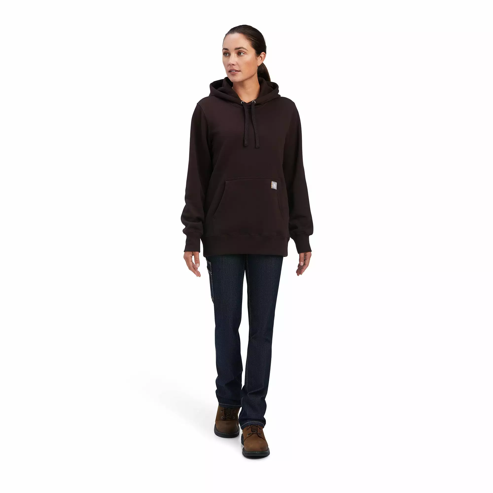 - Ariat logo tag on kangaroo pocket.