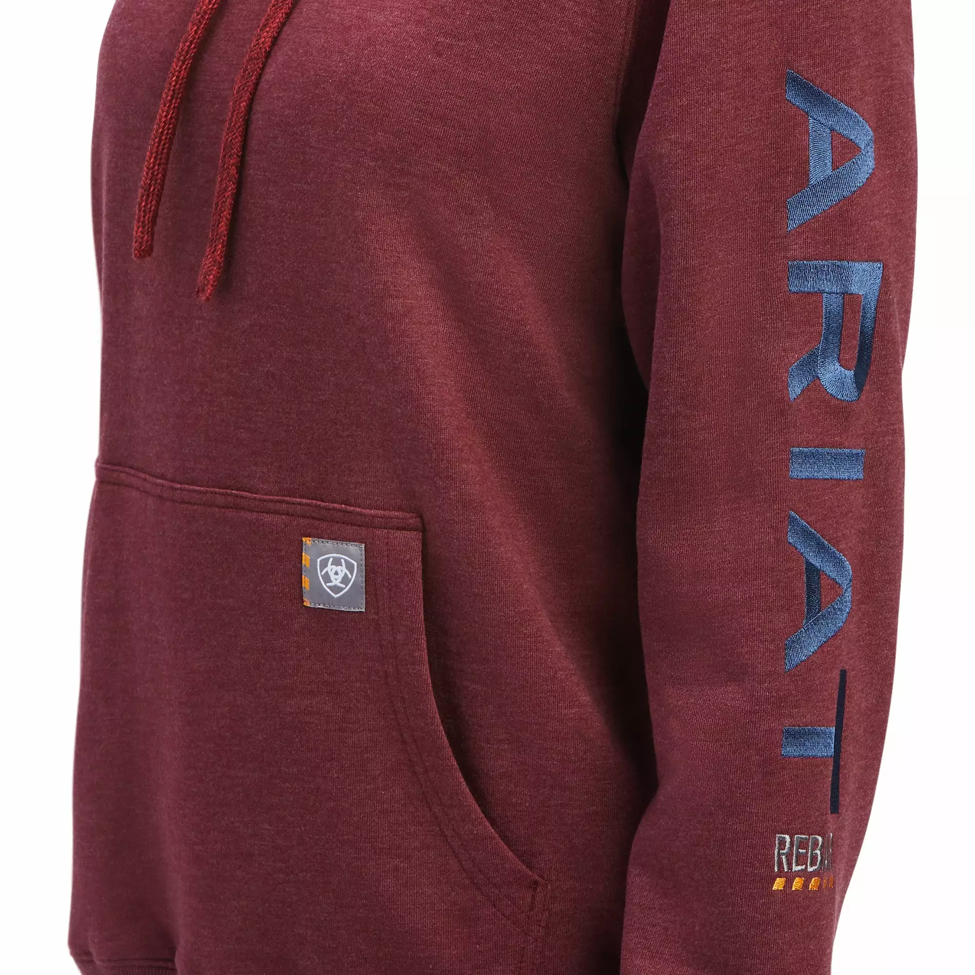 - Ariat logo tag on kangaroo pocket.