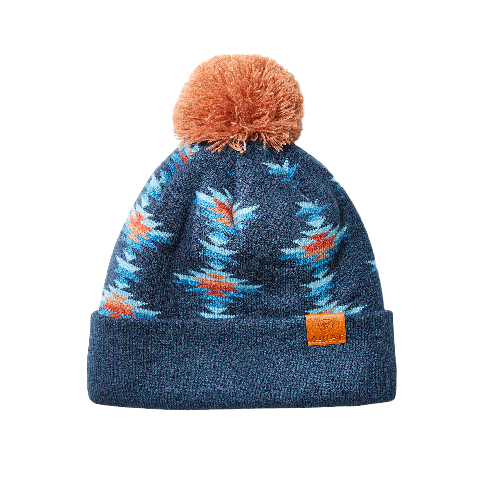 - Blue and orange aztec printed cozy beanie.
