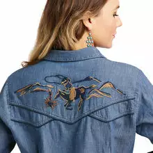 - Embroidered western scene at back yoke