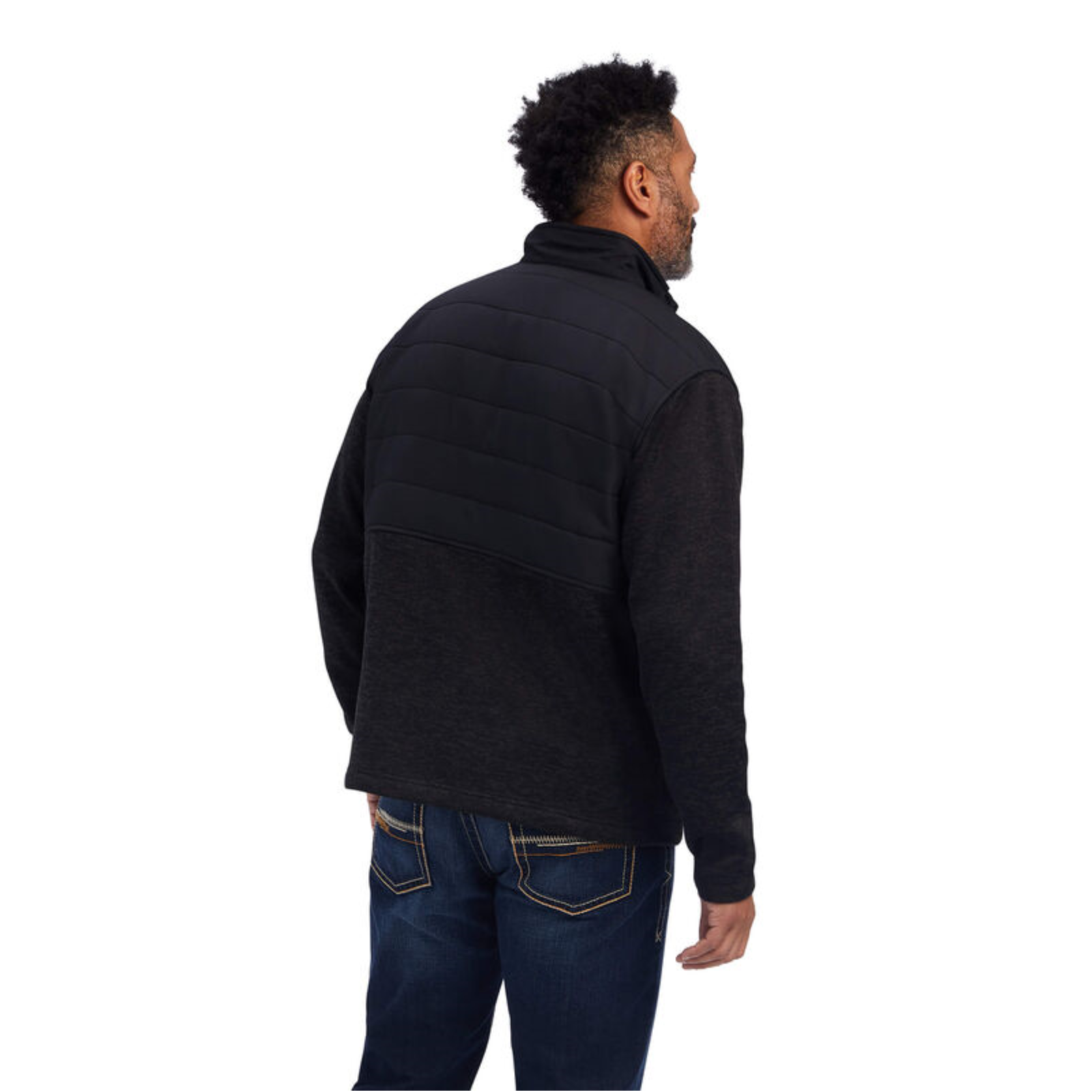 - Solid black quilted yokes and collar.