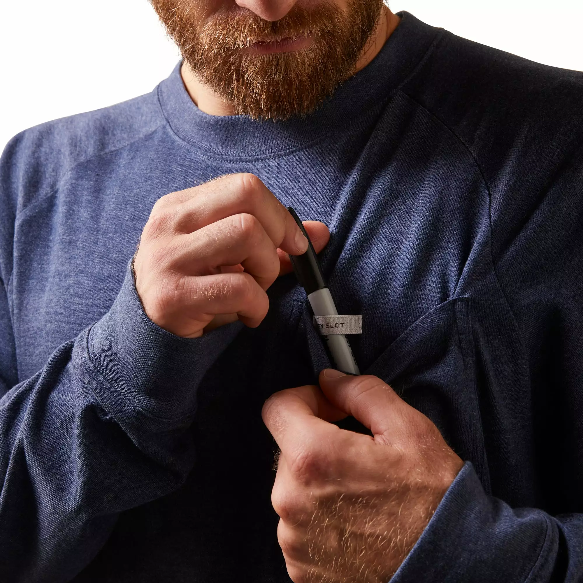 - Chest pocket with hidden pen slot.